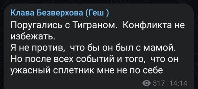 Клавдия Безверхова: Он ужасный сплетник! Клавдия Безверхова рассказала о конфликте с Тиграном Салибековым. + +5 - Новости и слухи 781